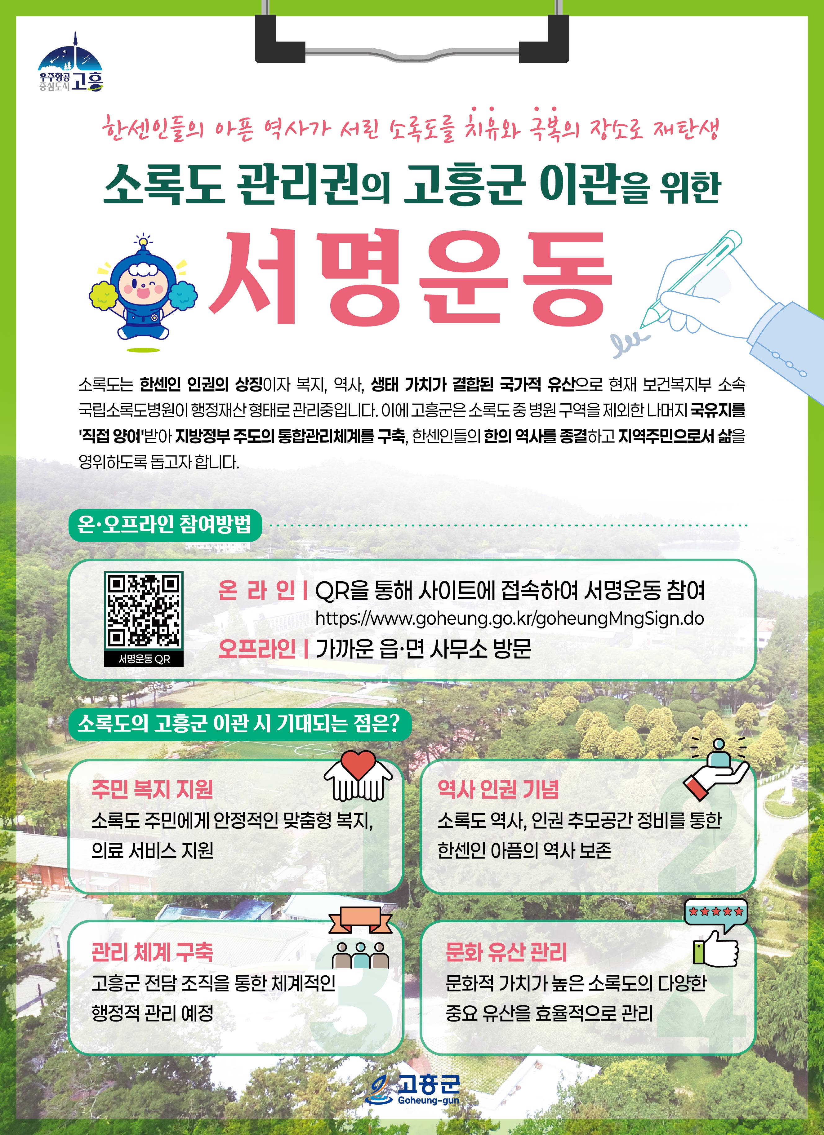 소록도 관리권의 고흥군 이관을 위한 서명운동을 안내하오니, 많은 관심과 협조를 부탁드립니다.