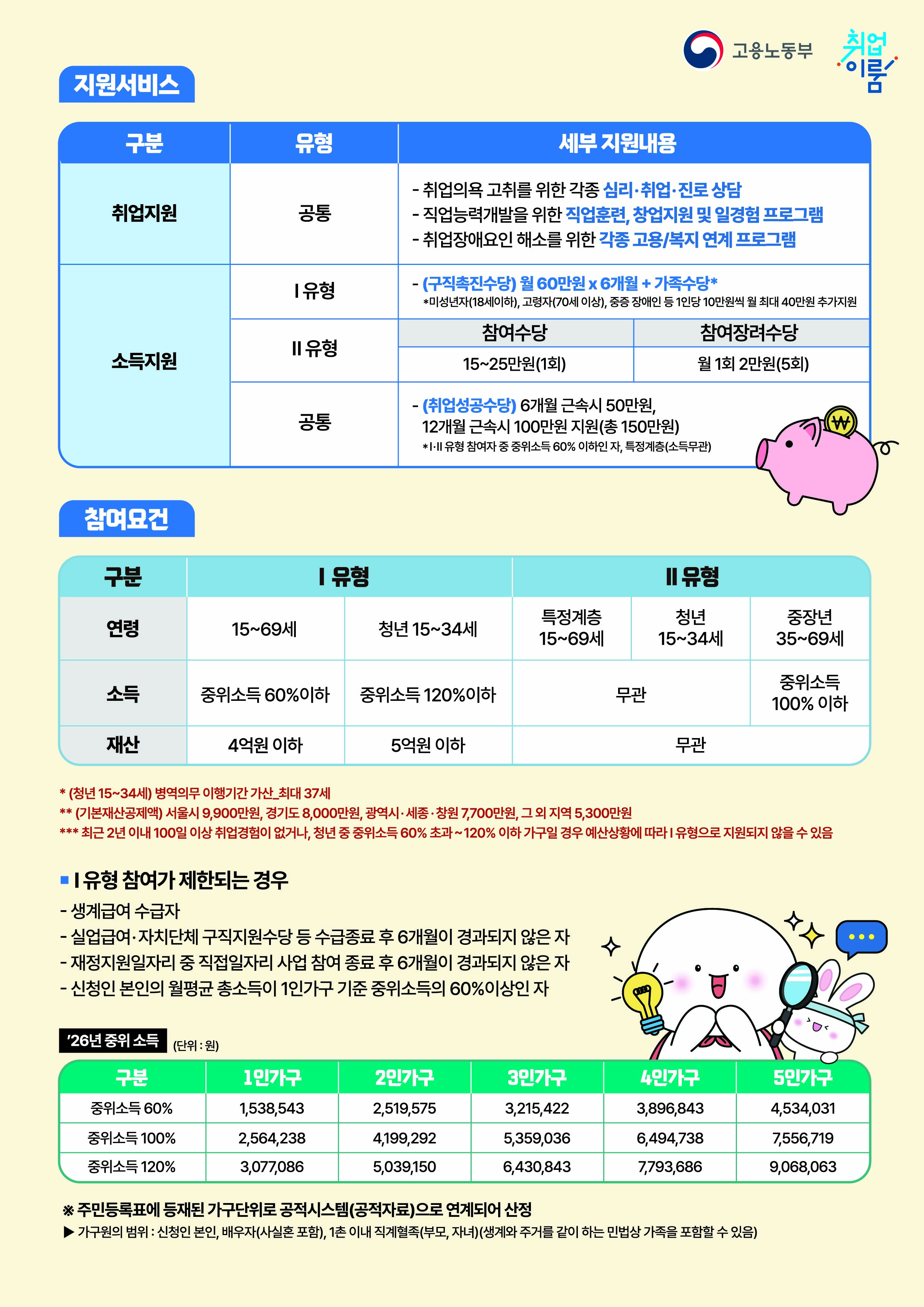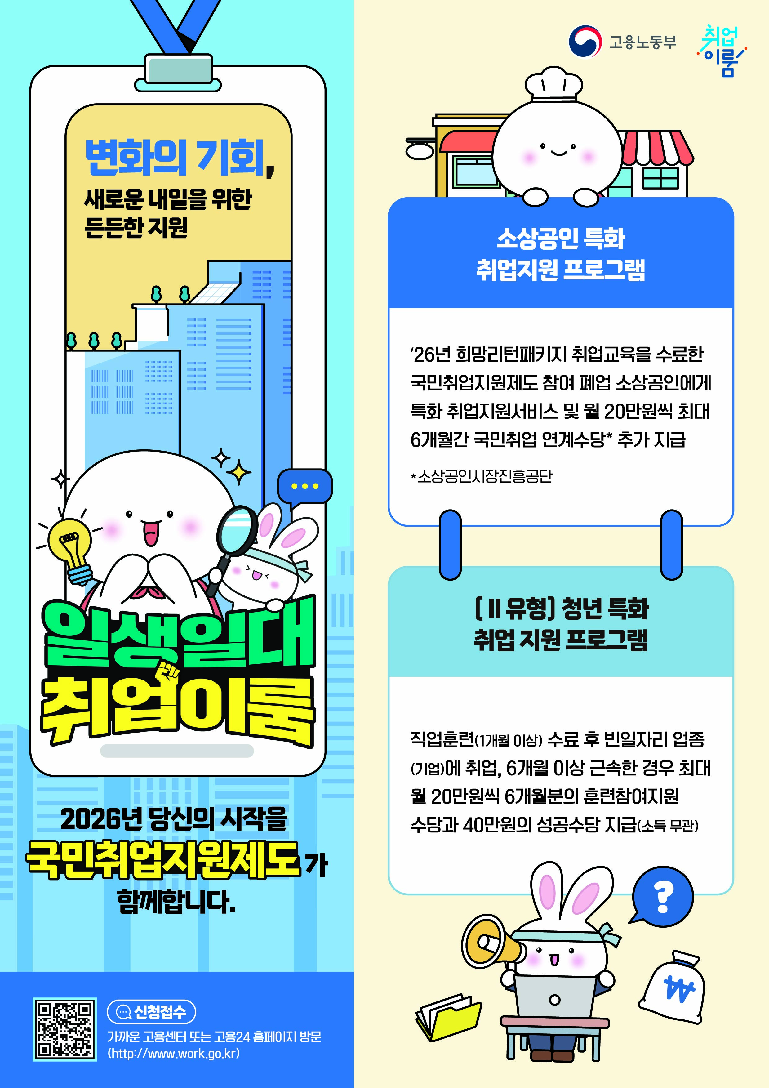 고용노동부에서 저소득 구직자, 청년 실업자, 경력단절여성 등 취업취약계층을 대상으로 취업지원서비스와 생계지원을 함께 제공하는 한국형 실업부조인 '국민취업지원제도'를 운영하오니 많은 참여바랍니다.