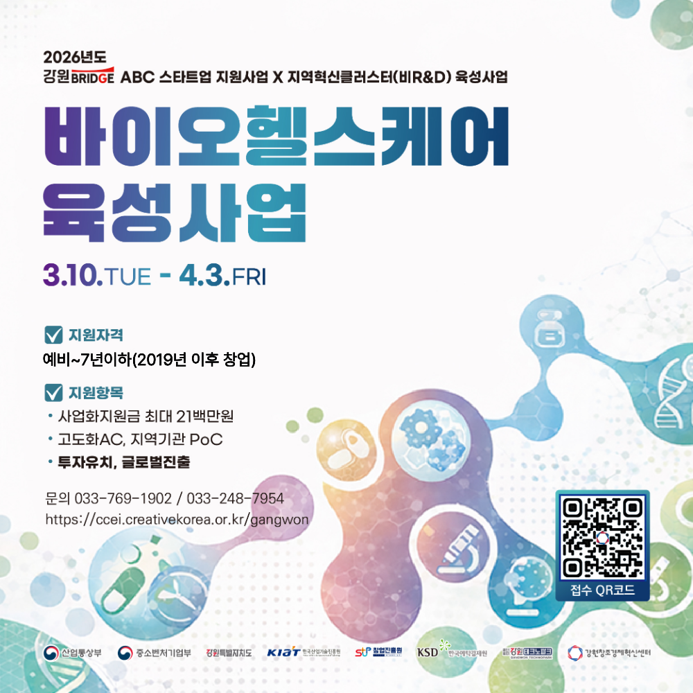 춘천시청이(가) 창작한 2026 바이오헬스케어 육성사업 참가자 모집 안내 저작물은 공공누리 "출처표시+상업적 이용금지+변경금지" 조건에 따라 이용할 수 있습니다.