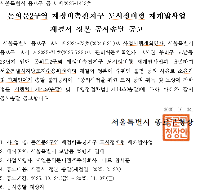 [서울특별시 종로구] 돈의문2구역 재정비촉진지구 도시정비형 재개발사업 재결서 정본 공시송달 공고문