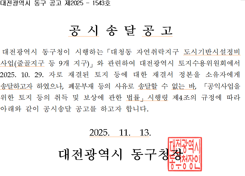 춘천시청이(가) 창작한 [대전광역시 동구] 공시송달공고 저작물은 공공누리 "출처표시+상업적 이용금지+변경금지" 조건에 따라 이용할 수 있습니다.