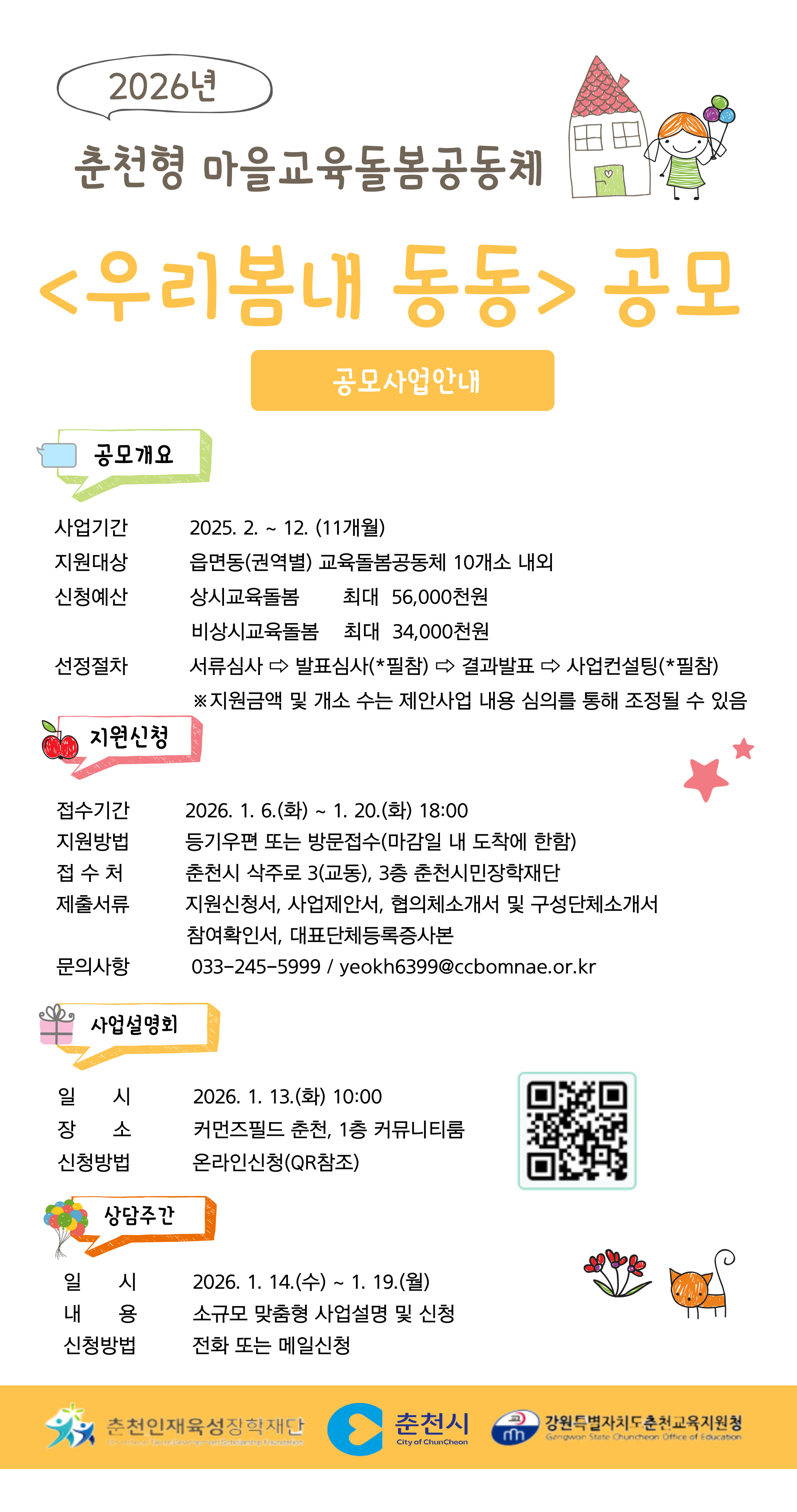 2026년 춘천형 마을교육돌봄공동체 지원사업 <우리봄내 동동> 공고