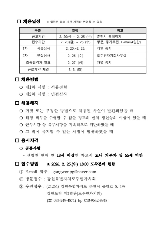 춘천시청이(가) 창작한 2026년 (사)도주민자치회 직원 채용공고 저작물은 공공누리 "출처표시+변경금지" 조건에 따라 이용할 수 있습니다.