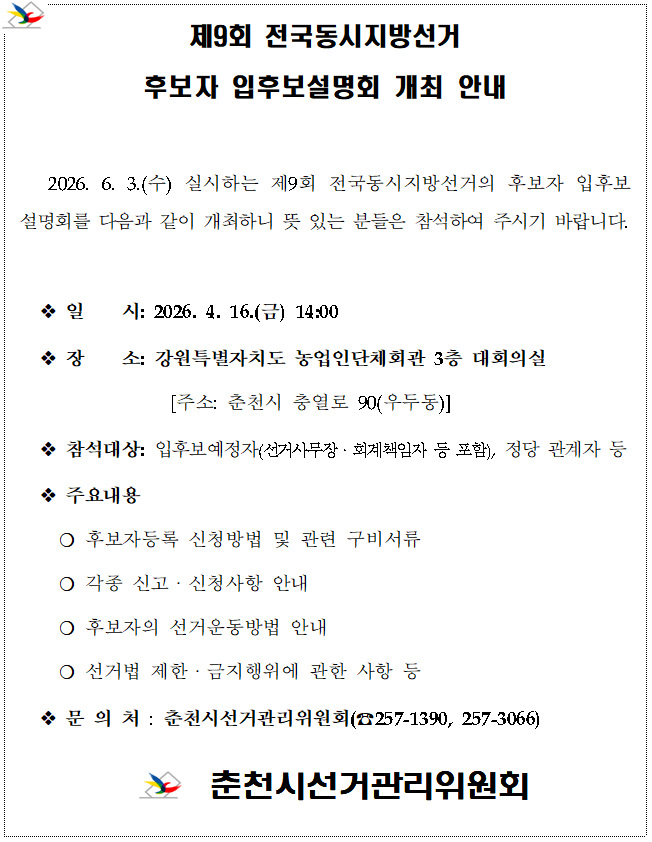제9회 전국동시지방선거 후보자 입후보설명회 개최 안내(춘천시선관위)