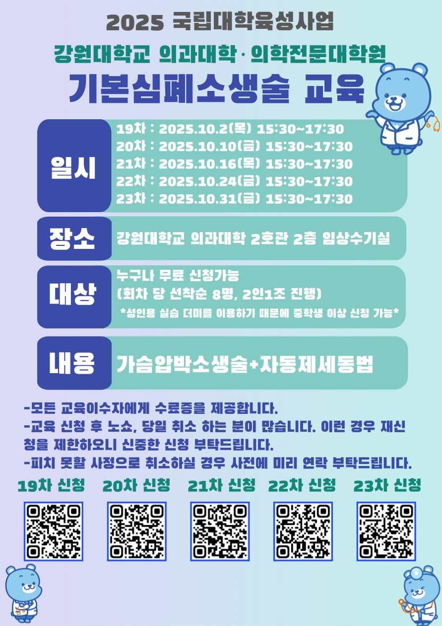 강원대학교 의과대학‧의학전문대학원에서는 지역사회의 보건의료 안전망을 강화하기 위하여 춘천시 내 일반시민들을 대상으로 하는 기본심폐소생술 교육을 다음과 같이 개최합니다. 많은 참여 부탁드립니다 :)