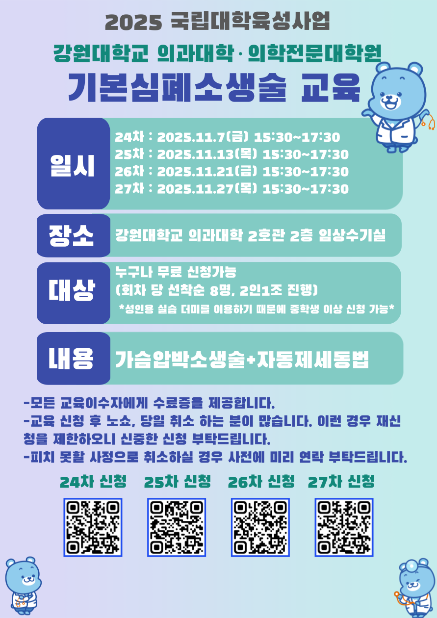 강원대학교와 함께하는 춘천시 내 일반시민 대상 무료 기본심폐소생술 교육 안내(11월)