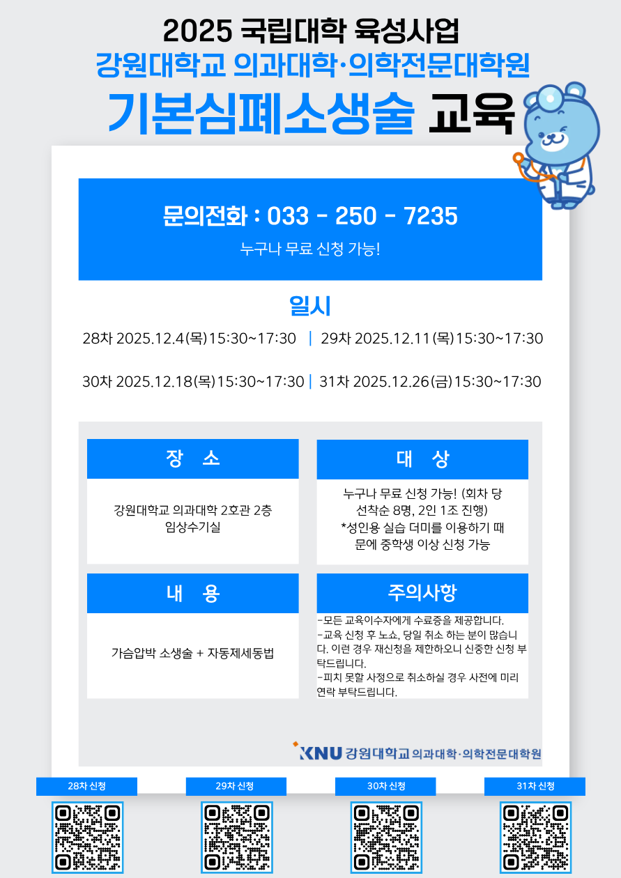강원대학교와 함께하는 춘천시 내 일반시민 대상 무료 기본심폐소생술 교육 안내(12월)