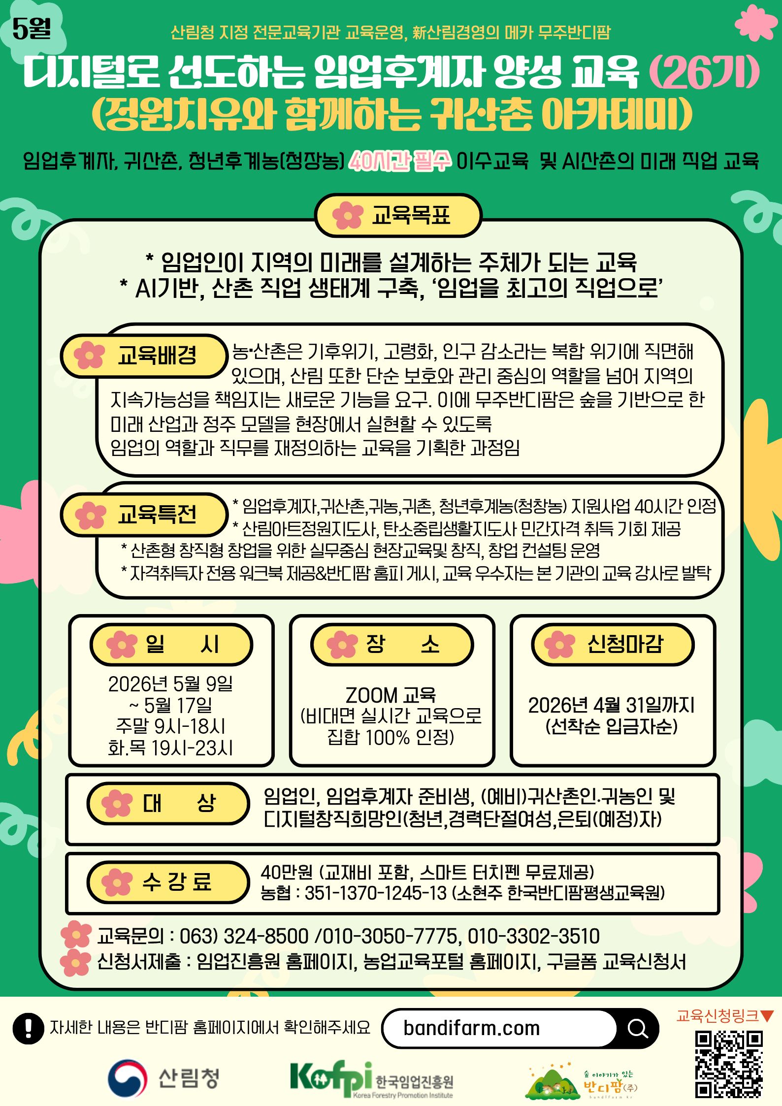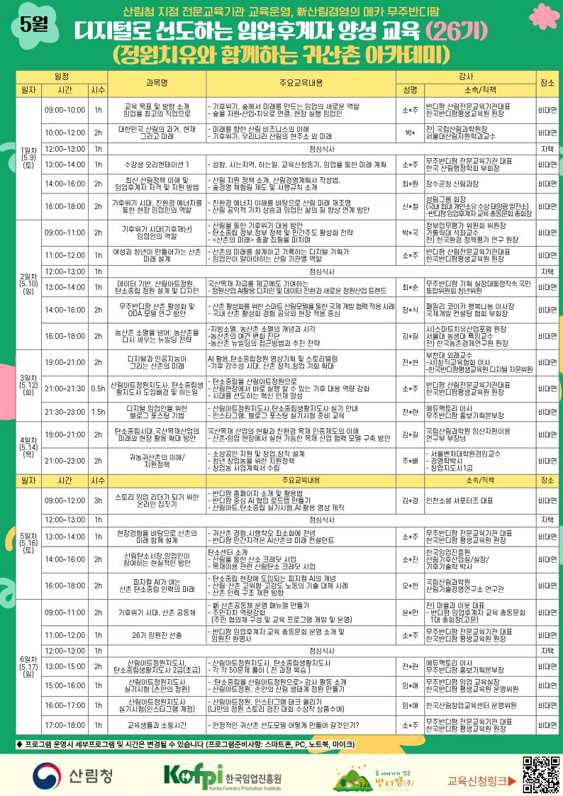 https://litt.ly/sforest 교육명: 디지털로 선도하는 임업후계자 양성 교육 (26기) (정원치유와 함께하는 귀산촌 아카데미 ) 교육목표: 임업인이 지역의 미래를 설계하는 주체가 되는교육 - AI기반, 산촌 직업생태계 구축, "임업을 최고의 직업으로" *교육배경: 농•산촌은기후위기,고령화, 인구 감소라는 복합위기에 직면 해있으며 ,산림 또한 단순보호와 관리 중심 역할을 넘어 지역의 지속가능성을 책임지는 새로운 기능을 요구, 이에 무주반디팜은 숲을 기반으로 한 미래 산림산업과 정주모델을 현장에서 실현 할수 있도록 임업의 직무를 재정의하는 교육을 기획함 교육 신청서 https://forms.gle/EqgVXzwUNsU86ENGA 교육신청서 작성후 수강료 입금하시면 신청완료 수강료: 40만원 입금계좌: 농협 351- 1370- 1245 - 13 소현주 한국반디팜평생교육원 교육문의: 063-324-8500 각분야 최고의 강사님을 모셨습니다. 좋은 교육이 되도록 최선을 다하겠습니다. 무주반디팜 산림전문교육기관 대표 소현주 올림