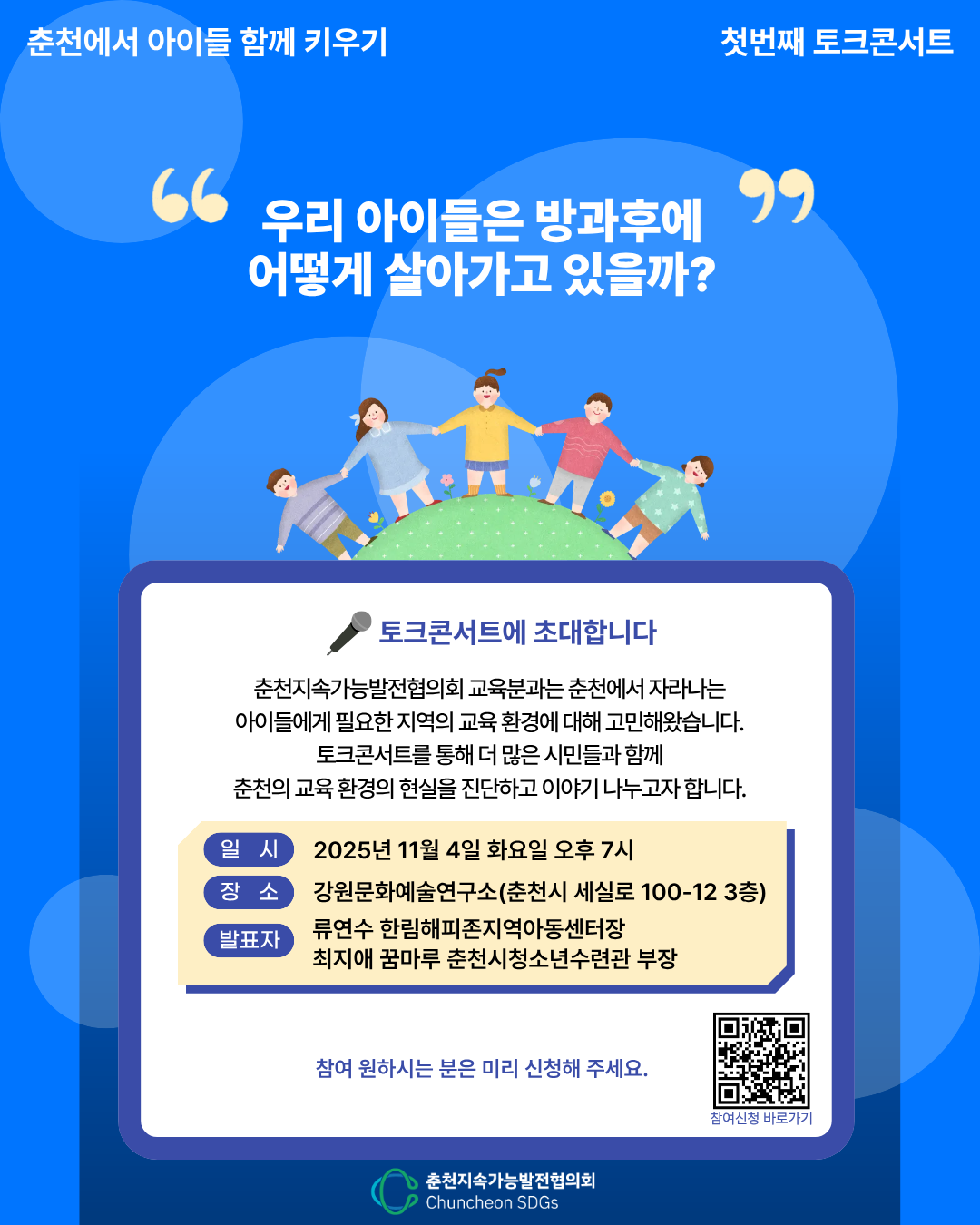 춘천에서 아이들 함께 키우기라는 주제로 열리는 [첫 번째 토크 콘서트]에 초대합니다.