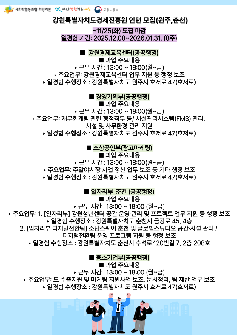 원주, 춘천 강원특별자치도경제진흥원 인턴을 모집합니다! 신청과 자세한 운영계획서는 청년 일경험 포털에서 경제진흥원 검색 부탁드립니다 :) 감사합니다!