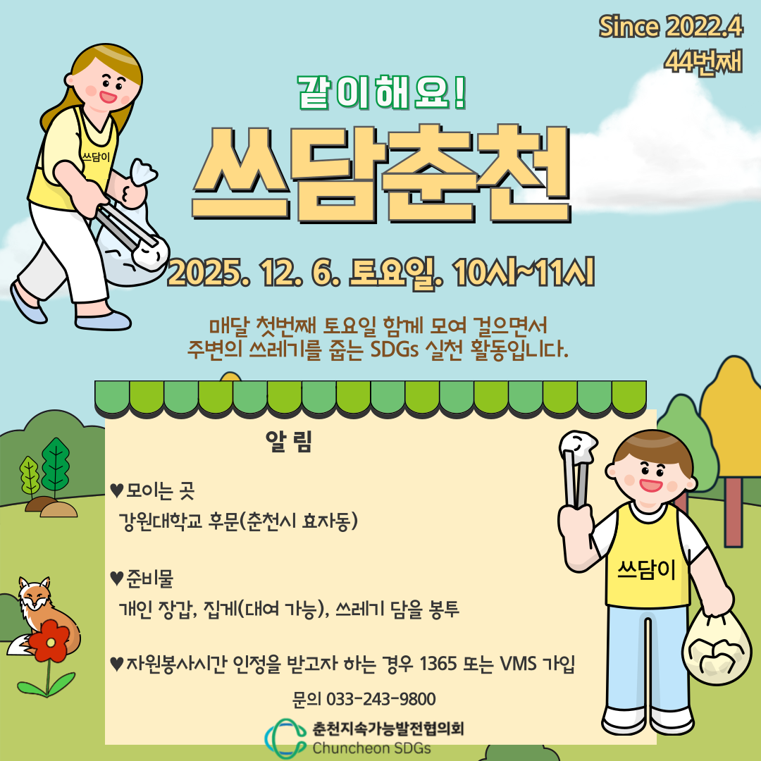 12월 6일 토요일 44번째 쓰담춘천을 진행합니다.💚