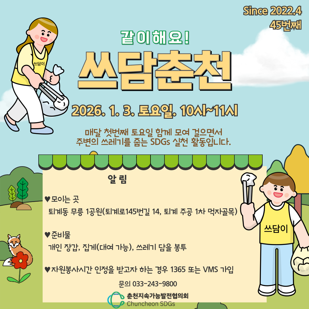 1월 3일 토요일 45번째 쓰담춘천을 진행합니다.