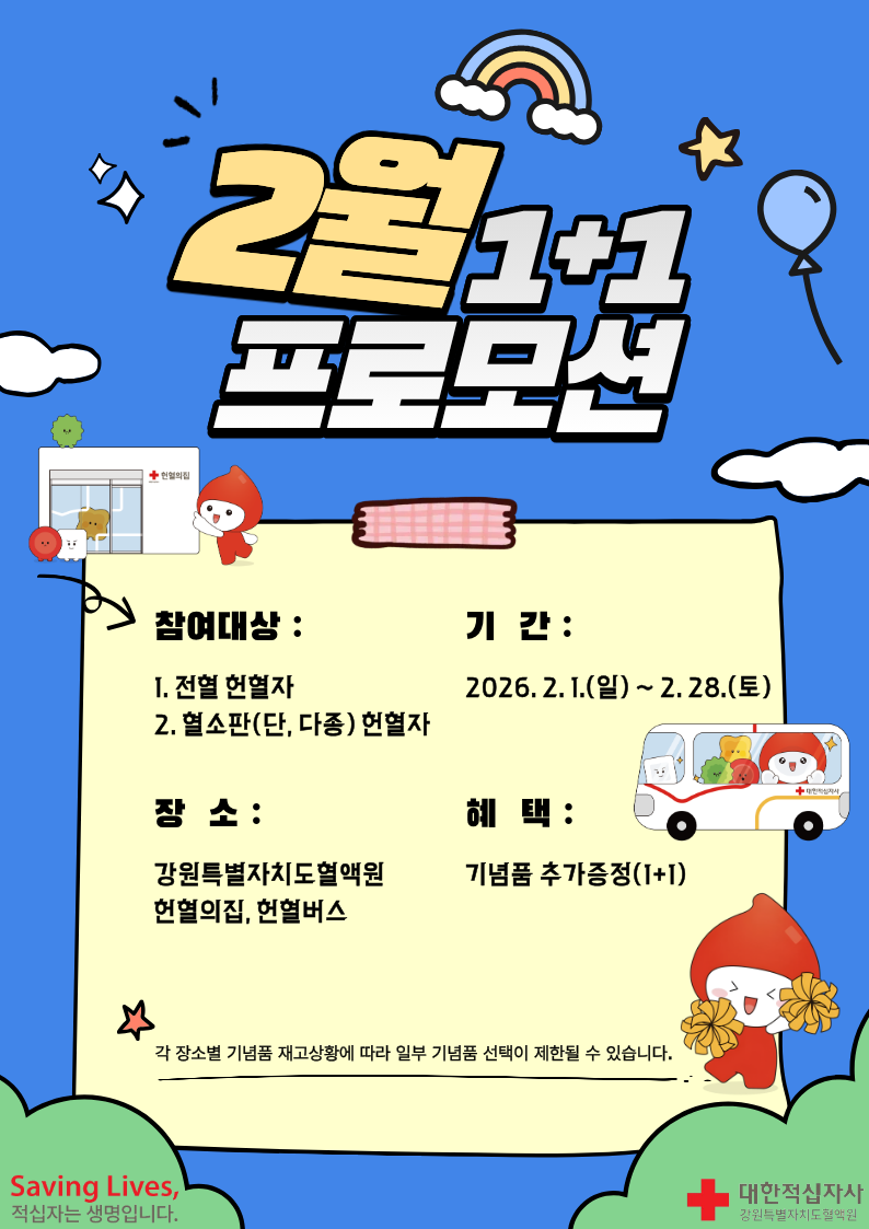 소중한 생명을 살리는 따뜻한 발걸음에 동참해 주시는 헌혈자분들을 위해 2월 한달간 1+1 프로모션을 준비했습니다.