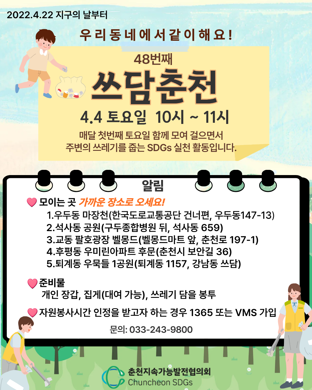 4월 4일 토요일 48번째 쓰담춘천을 다섯 곳에서 진행합니다.