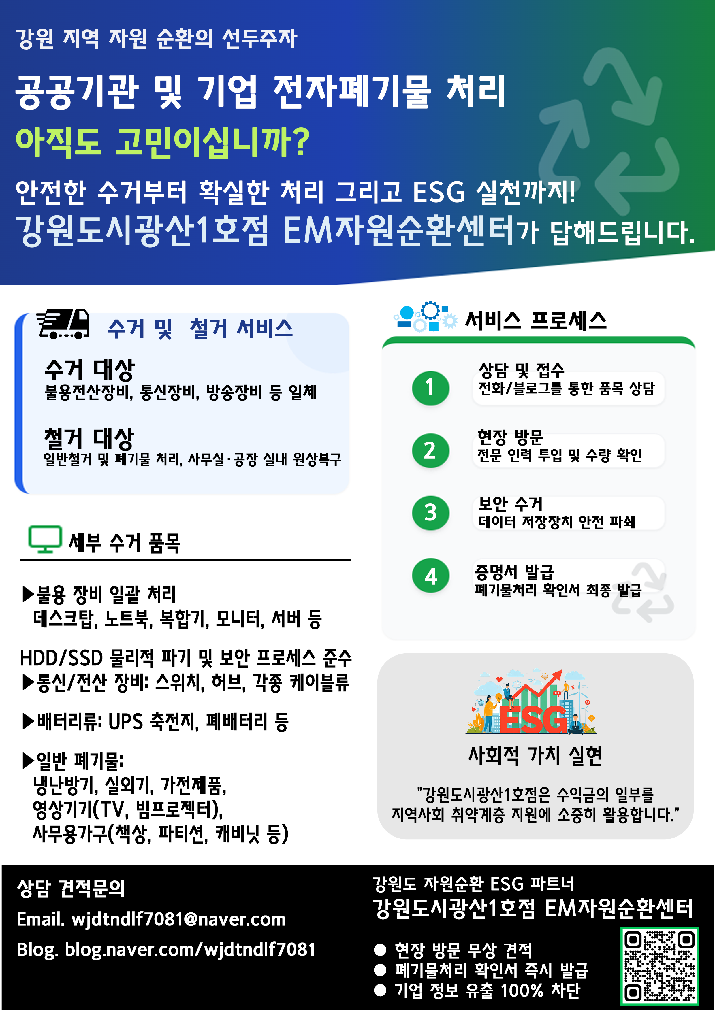 강원도 내 공공기관, 학교, 기업체 어디든 달려갑니다. 전자폐기물 처리가 필요하시다면 지금 바로 연락 주세요!