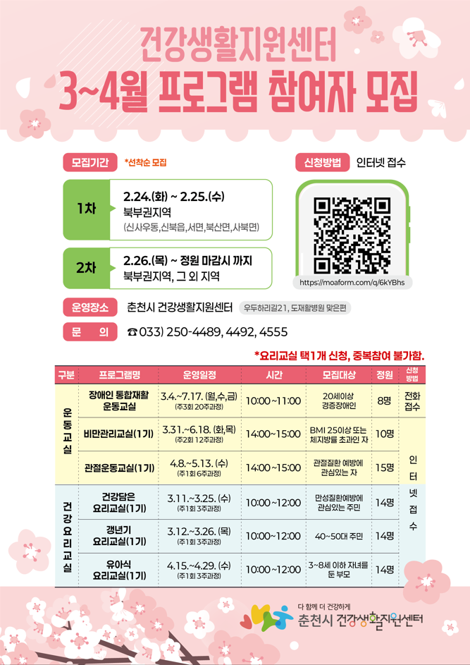 춘천시건강생활지원센터 3~4월 프로그램 참여자를 모집하오니 많은 참여 부탁드립니다.