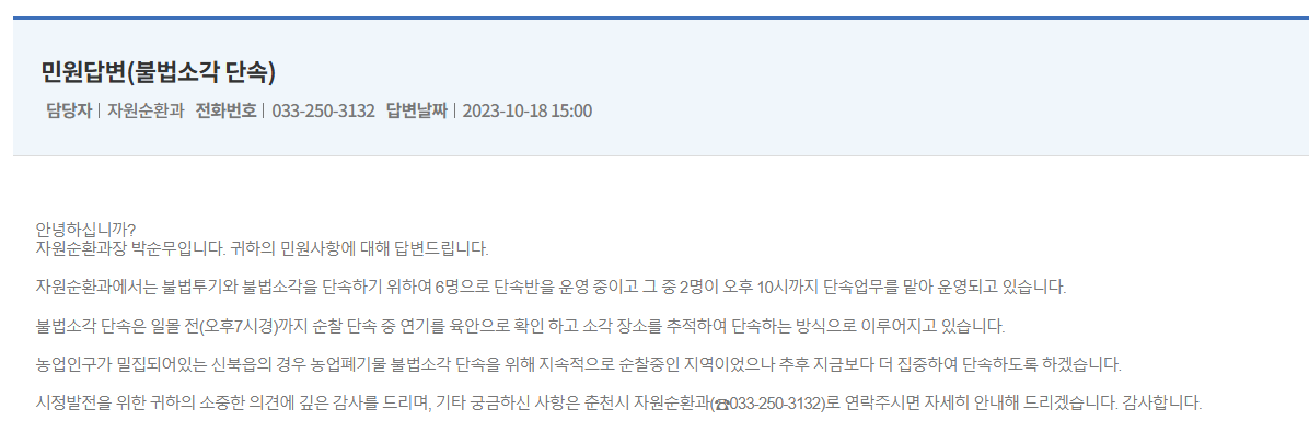 2023년에 본인은 불법소각 관련 민원을 제출한 바 있습니다.