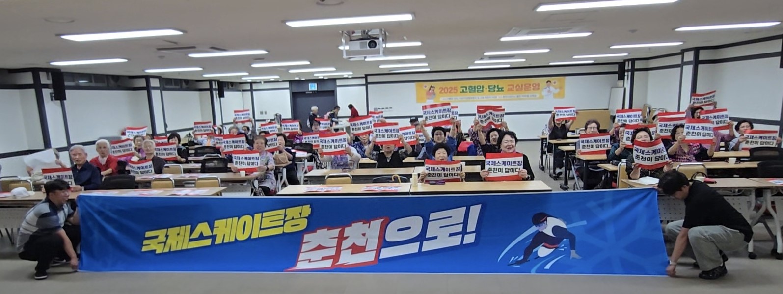 19일 보건소 별관 지하강당에서 열린 춘천노인대학 특강에서 수강생들이 국제스케이트장 춘천 유치를 응원하는 뜻을 함께했다.