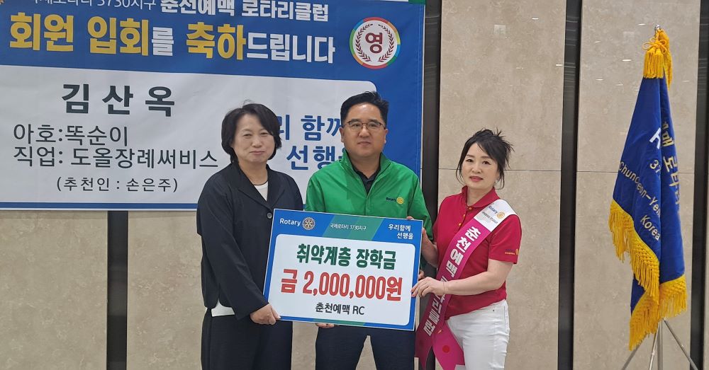 춘천예맥로타리클럽(회장 한지원)은 22일 강남동 행정복지센터에 동네 저소득층 학생들을 위한 장학금 200만원을 전달했다.