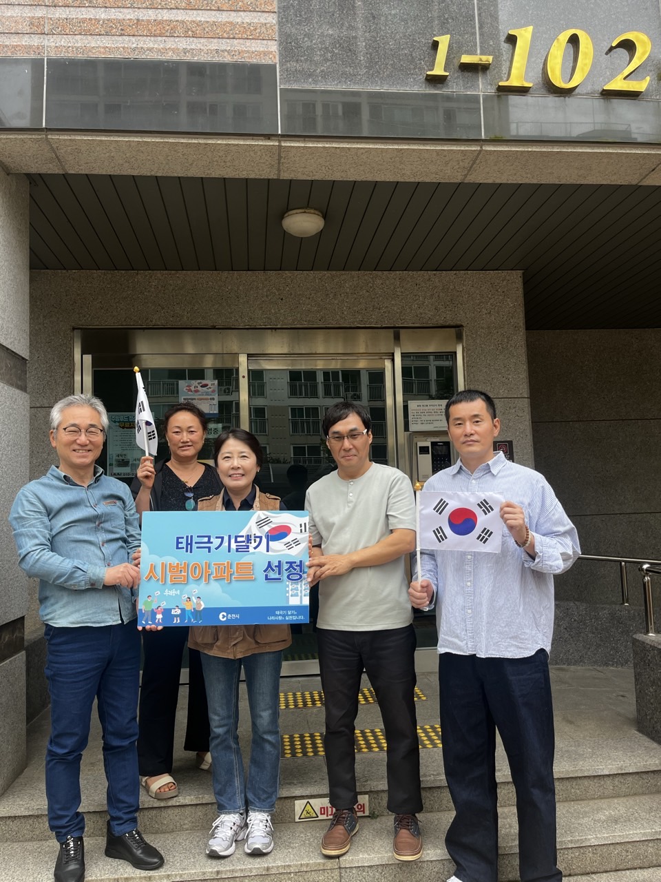 동면행정복지센터(면장 이혜경)는 24일 동면 대동다숲아파트를 태극기 달기 시범운영 아파트로 지정하고 만천6리 이장, 만천6리 6반장, 관리사무소장 등이 참석한 가운데 나라사랑 태극기달기 시범아파트 현판식을 개최했다.
