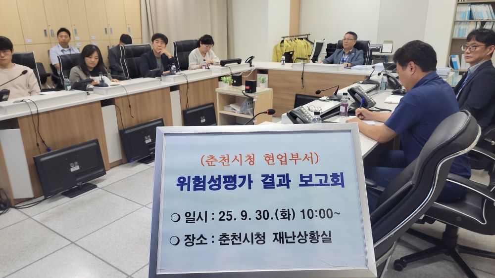 춘천시(시장 육동한)는 30일 시청 재난안전상황실에서 ‘2025년 춘천시청 위험성평가 결과 보고회’를 열었다. 이번 평가는 안전관리 전문기관 ㈜세이프지가 6월부터 8월까지 현업 54개 부서 94개 사업장을 대상으로 현장 확인과 종사자 인터뷰를 거쳐 진행했다. 결과에 따르면 개선대책을 이행하면 현업부서의 유해·위험요인이 50% 줄어드는 것으로 분석됐다.