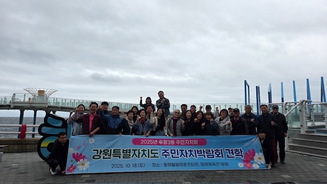 후평3동 주민자치회(회장 이효분)는 지난 18일 동해시 웰빙레포츠타운에서 진행된 강원특별자치도 주민자치박람회를 방문해 다양한 운영 사례와 주민자치 프로그램 경연 대회를 견학했다. 이번 견학을 통해 향후 마을 발전 방향과 사업 운영에 활용할 계획이다.