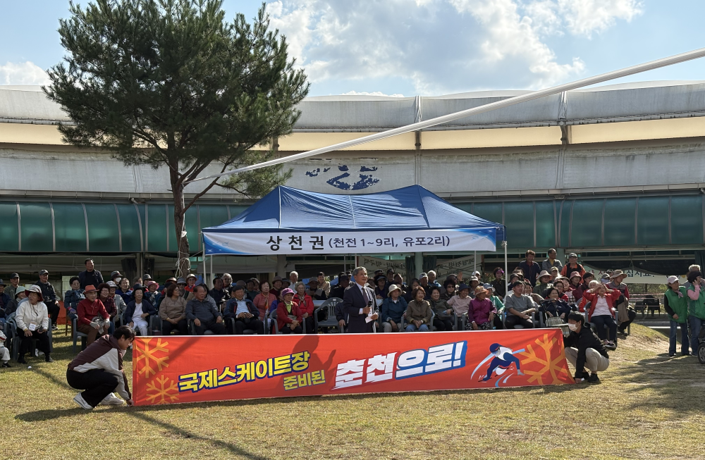 지난 25일 신북읍 샘밭장터에서 제21회 신북읍민의 날 기념 한마음 체육대회가 열린 가운데 시민들이 국제스케이트장 춘천 유치 응원에 동참했다.