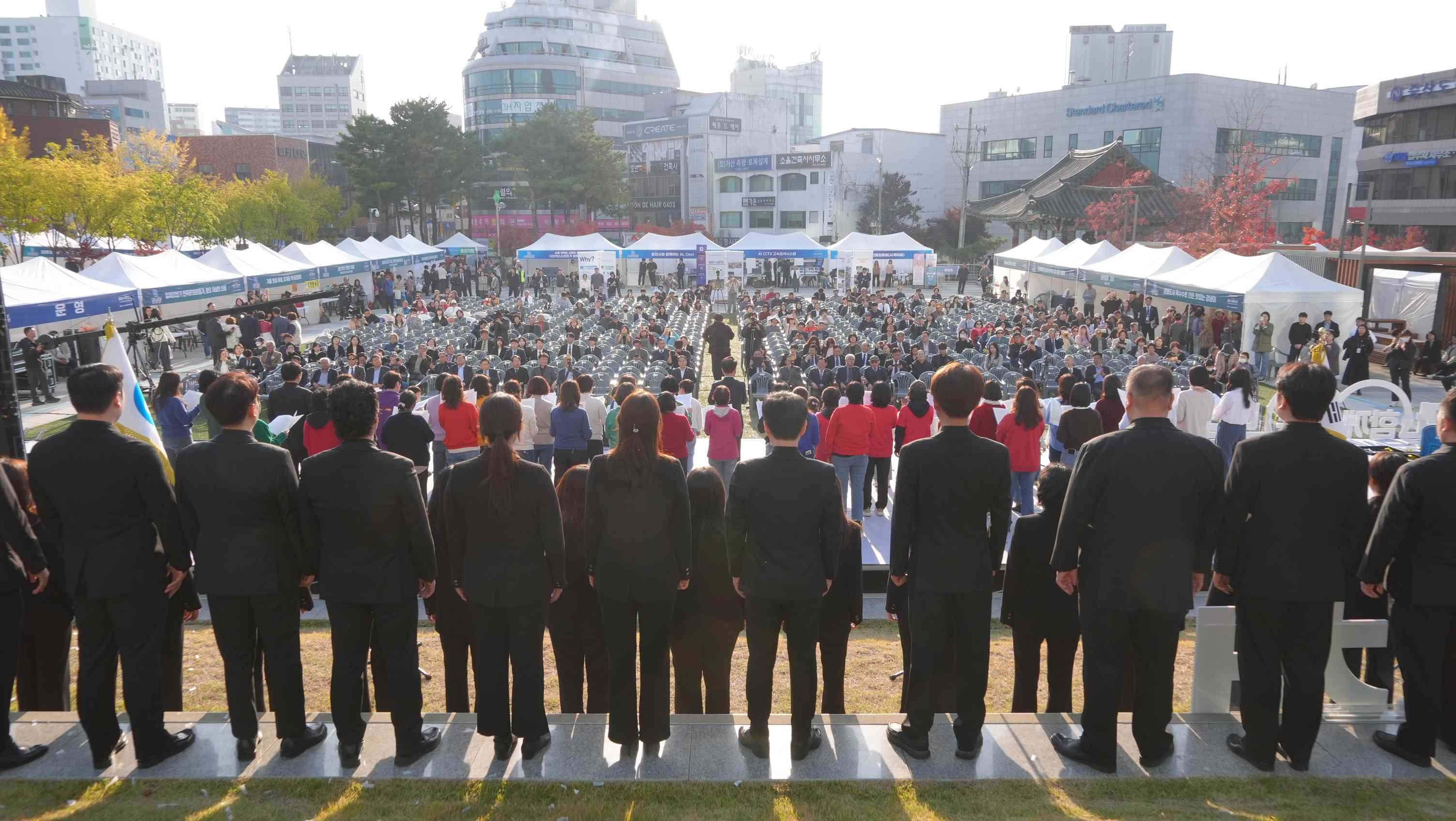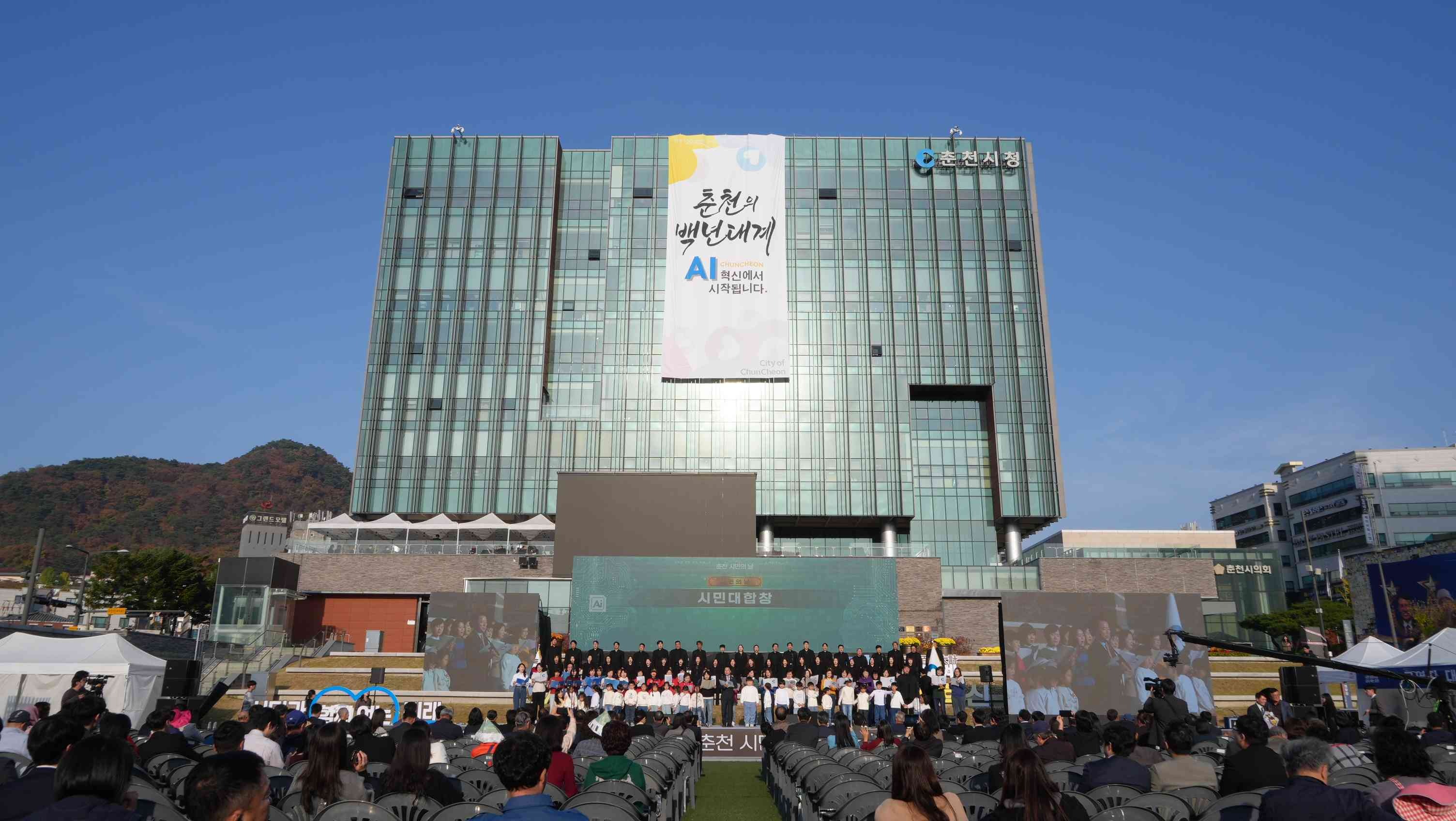 제23회 춘천시민의 날 기념행사’가 7일 시청광장에서 열린 가운데 축하공연으로 시립교향악단과 시립합창단, 온세대합창단 등 200여 명이 참여한 ‘시민대합창’이 울려 퍼지며 세대와 세대를 잇는 감동의 무대를 선사했다.