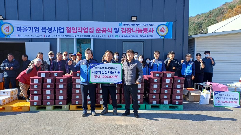 사북면행정복지센터(면장 이원영)는 12일 신포2리 절임작업장 준공에 맞춰 사북면이장협의회(협의회장 김석포), 주민자치위원회(위원장 송은총) 한국수력원자력(한강수력본부장 권창섭) 직원들과 함께 소외계층 지원을 위한 김장 나눔 행사를 열었다. 김장김치는 동네 150세대에 300박스가 전달된다.