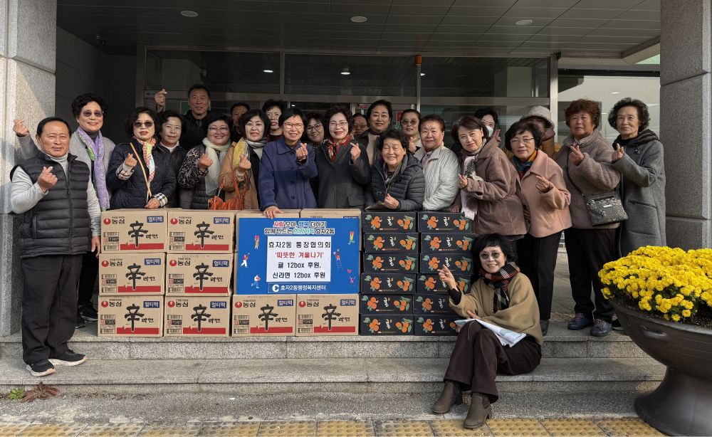 효자2동통장협의회(회장 김영숙)는 24일 동네 경로당 어르신들의 따뜻한 겨울나기를 위해 귤 12박스, 라면 12박스를 후원했다.