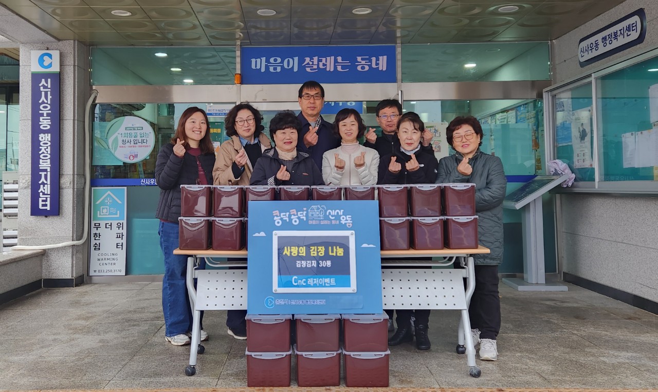 Cnc레저이벤트(대표이사 김덕만)는 25일 신사우동 독거노인 및 저소득가정을 위해 직접 만든 김장김치 30박스(5kg)를 후원했다.