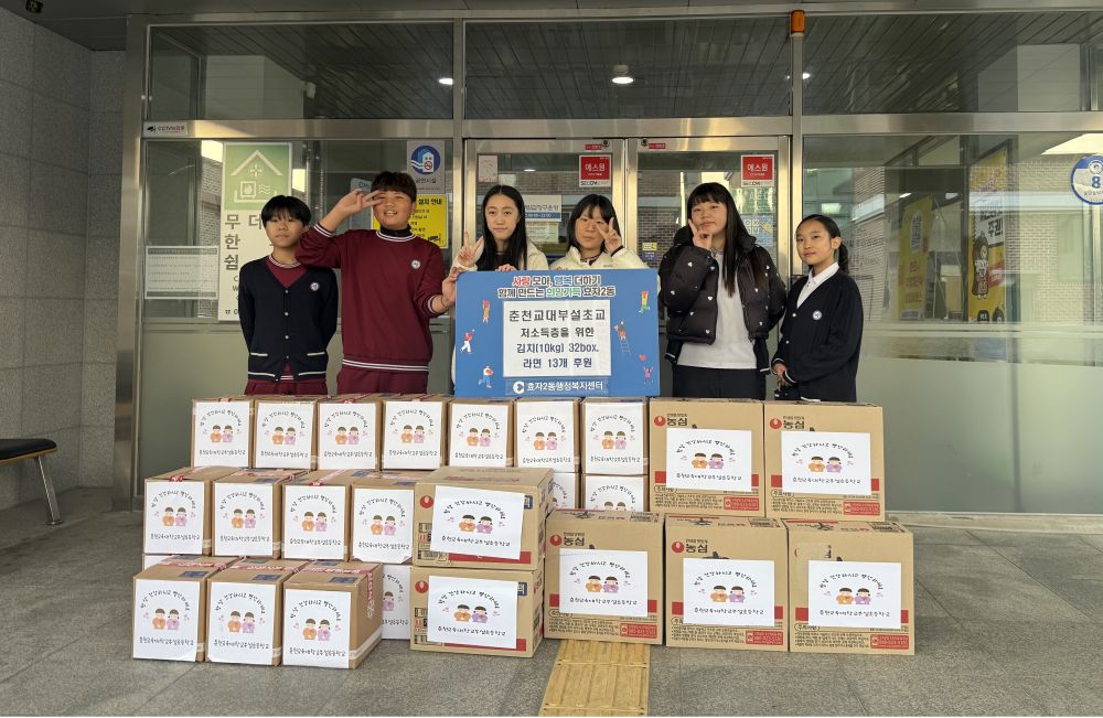 춘천교대부설초 학부모회와 달‧별‧솔 자치회는 지난 20일 효자2동 저소득층 주민들의 따뜻한 겨울나기를 위해 김장김치 5kg 32박스, 라면 320개를 후원했다.