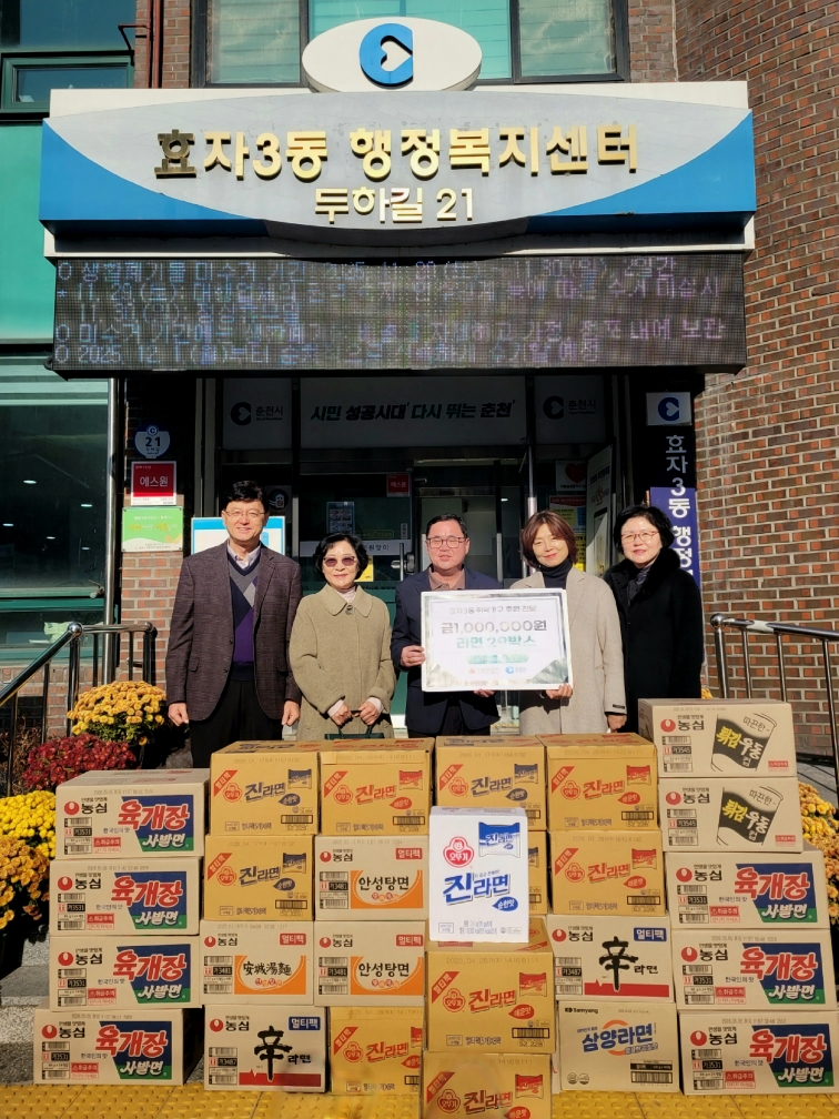 춘천중앙재림교회(담임목사 박명호)는 2일 효자3동 행정복지센터를 찾아 동네 취약가구를 위한 후원금 100만 원과 라면 29박스를 전달했다.