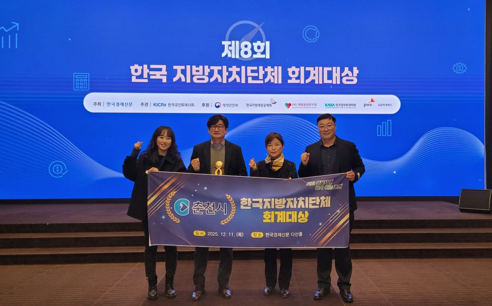 춘천시가 11일 서울 중구 한국경제신문 다산홀에서 열린 한국지방자치단체 회계대상 시상식에서 기초자치단체 부문 장려상을 수상했다. 지난해에 이어 두 번째 수상으로, 시가 지속적으로 추진해 온 회계 투명성 제고와 재정 건전성 강화 노력이 다시 한번 공식적으로 평가받았다.