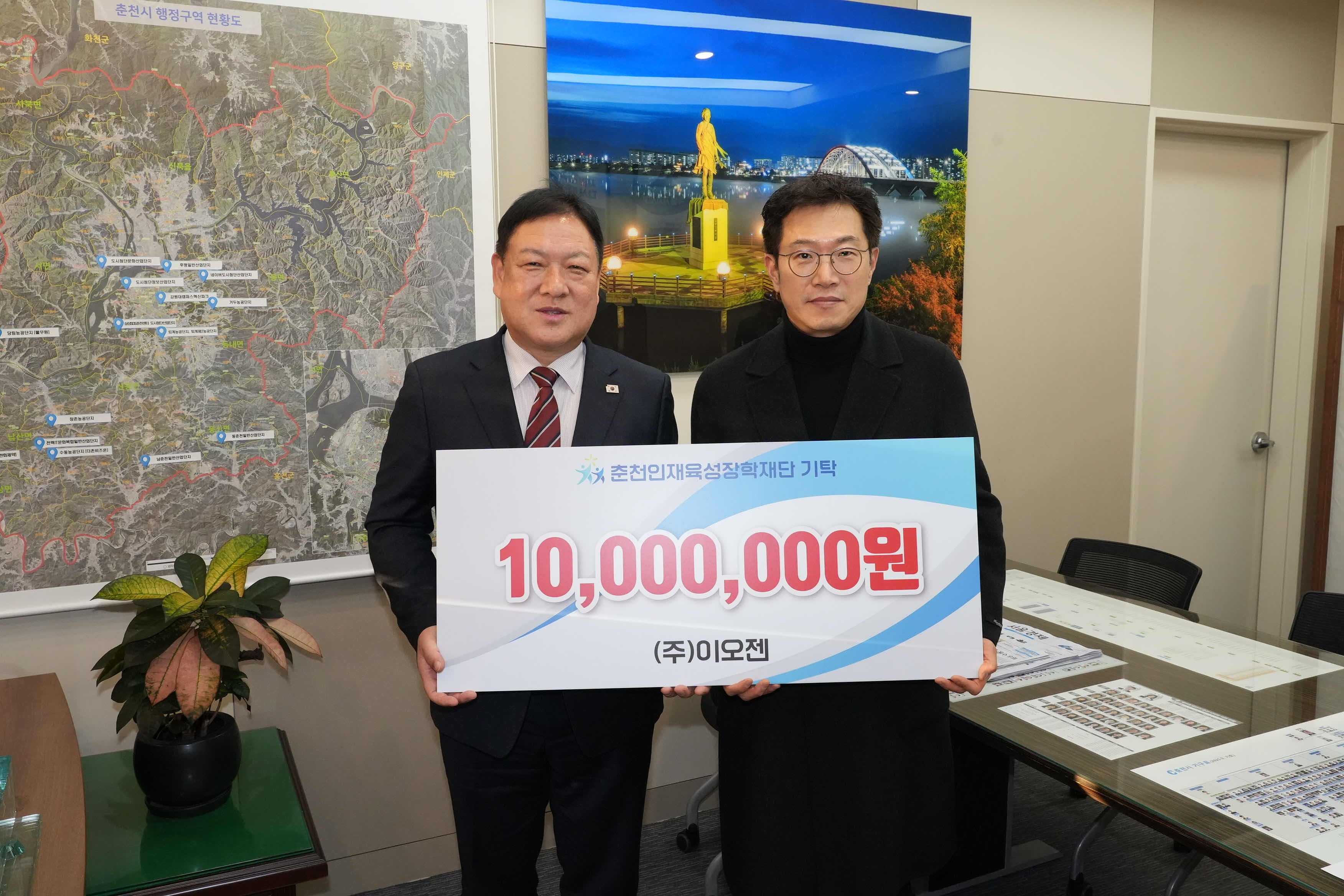 ㈜이오젠(대표 유영민)은 지난 30일 춘천시청 접견실에서 총 1,000만 원의 장학금을 (재)춘천인재육성장학재단(이사장 육동한)에 기탁했다. 이번 기탁은 지역 인재 육성과 교육 발전을 위한 뜻을 모은 것으로 기탁자와 시·재단 관계자들이 함께한 가운데 진행됐다.