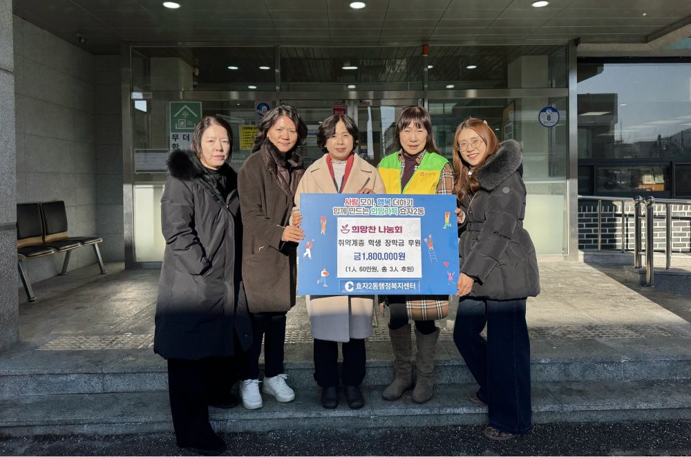 희망찬나눔회(회장 최초희)는 13일 효자2동행정복지센터를 찾아 저소득층 아동 3명을 위한 장학금 180만 원을 지정기탁했다.