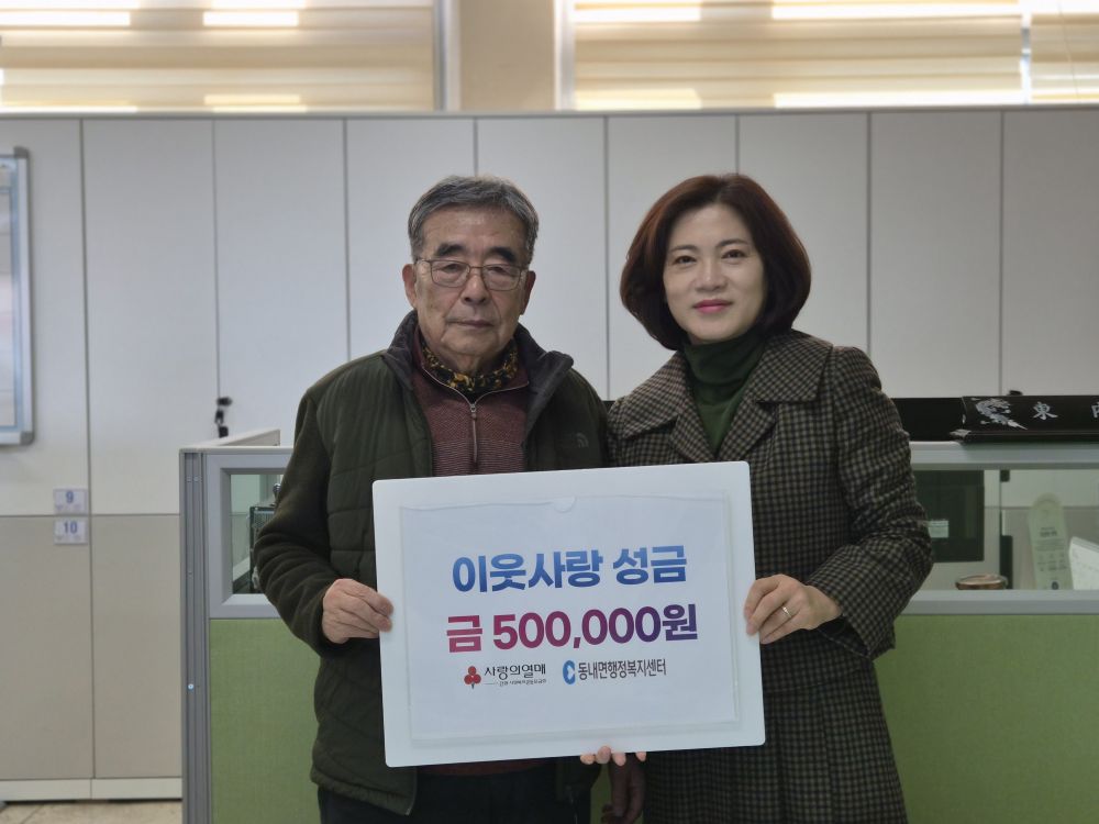 춘천시 동내면에 거주하는 김달식 씨(80)는 13일 동내면행정복지센터(면장 최명애)에 어려운 이웃을 위해 써달라며 성금 50만원을 기부했다. 이 성금은 동내면지역사회보장협의체와 연계해 동네 어려운 이웃을 위해 사용될 예정이다.