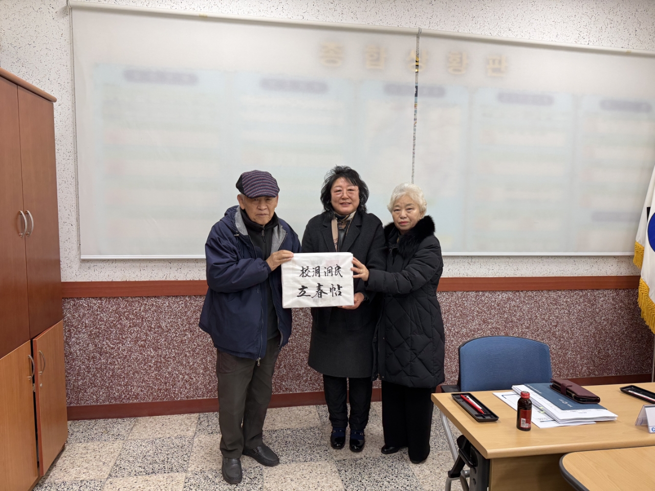 교동주민자치센터 서예교실(강사 홍수의, 반장 윤기명) 수강생은 26일 교동행정복지센터(동장 최연순)에서 입춘을 맞아 새해의 길운을 기원하는 입춘첩을 전달했다.