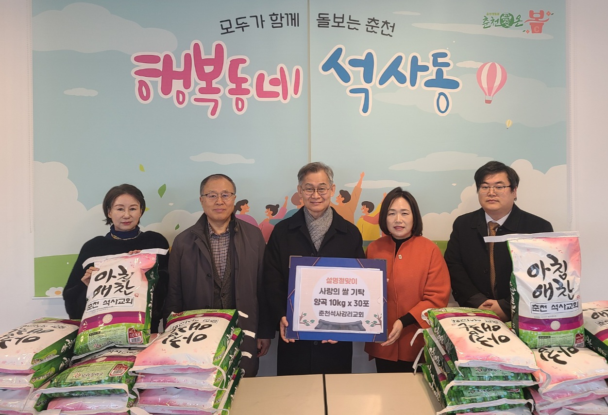 춘천석사감리교회(담임목사 손학균)는 4일 설 명절을 맞아 석사동 어려운 이웃에게 전달해 달라며 양곡 10kg짜리 30포(100만원 상당)를 석사동행정복지센터에 기탁했다. 기탁된 쌀은 기초생활수급자 및 차상위계층 등 경제적으로 어려운 이웃에게 전달될 예정이다.