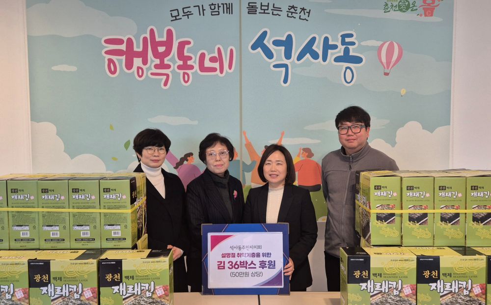 석사동주민자치회(회장 박병관)는 10일 석사동행정복지센터(동장 조영주)를 방문해 취약계층을 위한 김 36박스(50만원 상당)를 후원했다. 석사동주민자차회는 매년 명절마다 지역 취약계층을 위한 정기적인 기부를 이어오고 있으며 석사동 지역사회 나눔문화 형성에 노력하고 있다.