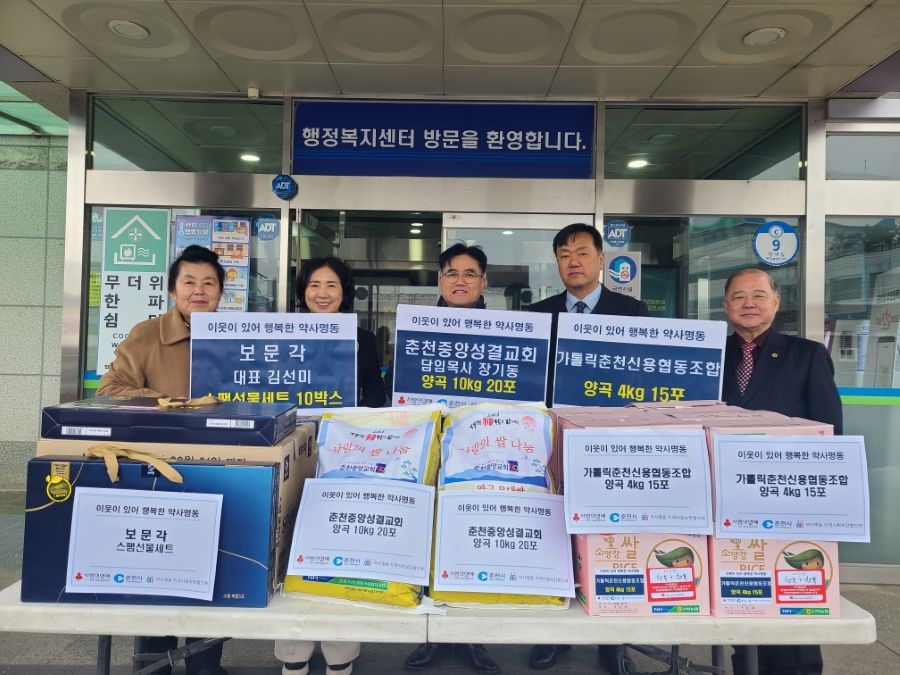 약사명동에 위치한 춘천중앙성결교회(담임목사 장기동)와 가톨릭춘천신협(이사장 배종호), 보문각(대표 김선미)은 11일 설명절을 맞아 약사명동행정복지센터에 각각 양곡 200kg, 양곡 60kg,. 햄 선물세트 10개를 후원했다.
