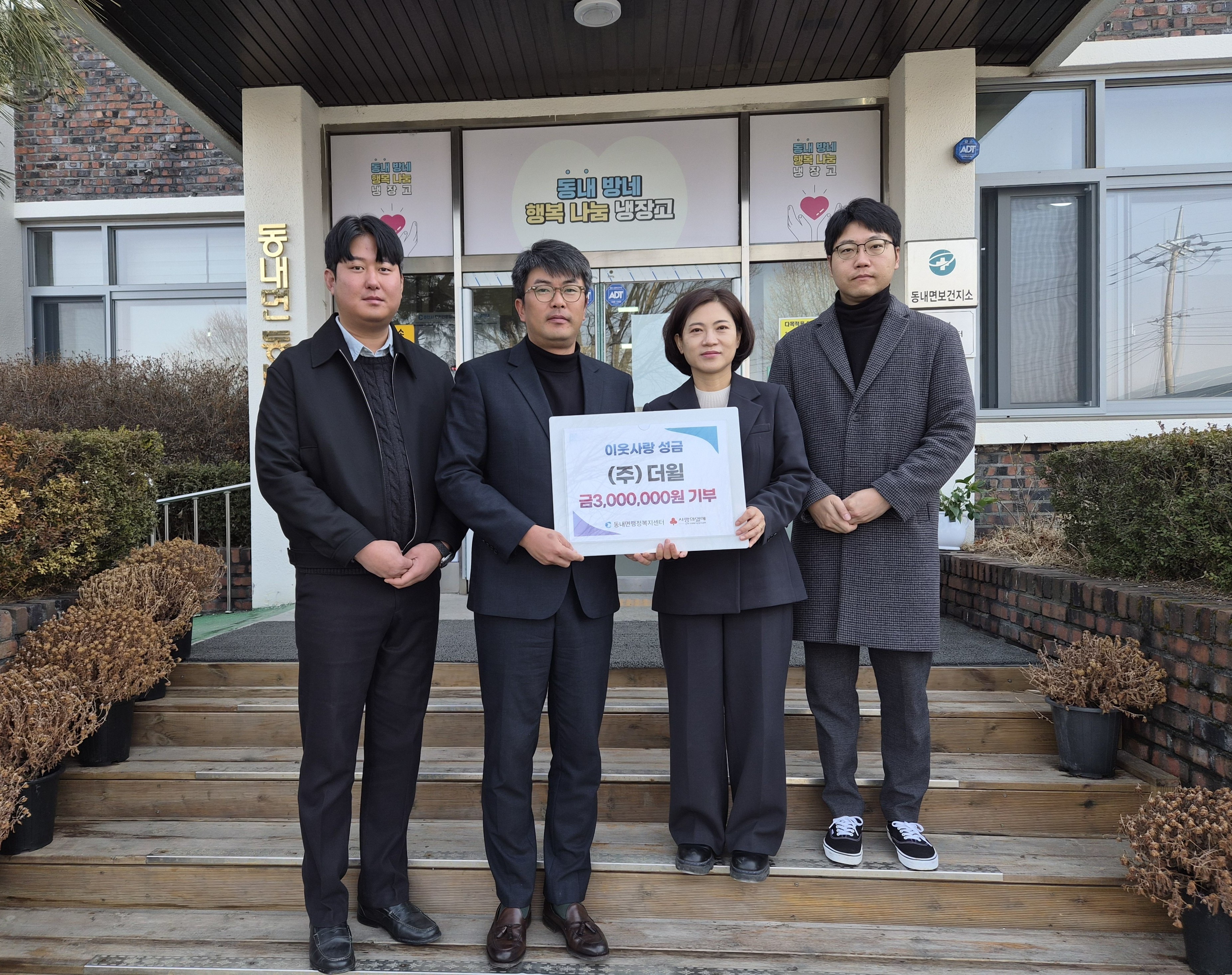주식회사 더윌(대표 안재규)는 5일, 동내면행정복지센터(면장 최명애)에 어려운 이웃을 위해 써달라며 성금 300만 원을 기부했다.