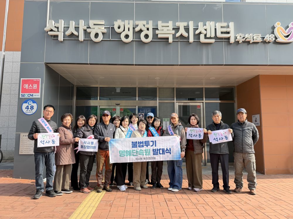 석사동통장협의회(회장 왕선자)는 11일 생활쓰레기 불법투기를 근절하기 위해 불법투기 명예 단속원 발대식을 개최했다. 이들은 구역을 8곳으로 으로 나눠 매주 환경정화 활동을 실시할 계획이다.