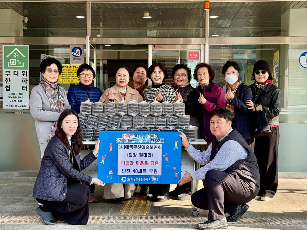사단법인 예맥무천예술보존회(회장 권태리)는 12일 효자2동 저소득층 주민들을 위해 직접 만든 반찬(3종) 40세트를 효자2동 행정복지센터에 후원했다.