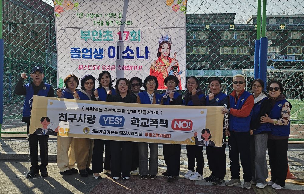 후평2동 바르게살기운동협의회(위원장 최경숙)는 25일 부안초등학교 앞에서 등교하는 학생들을 대상으로 건전하고 행복한 학교 생활 확립을 위한 학교폭력 예방 캠페인을 실시했다.