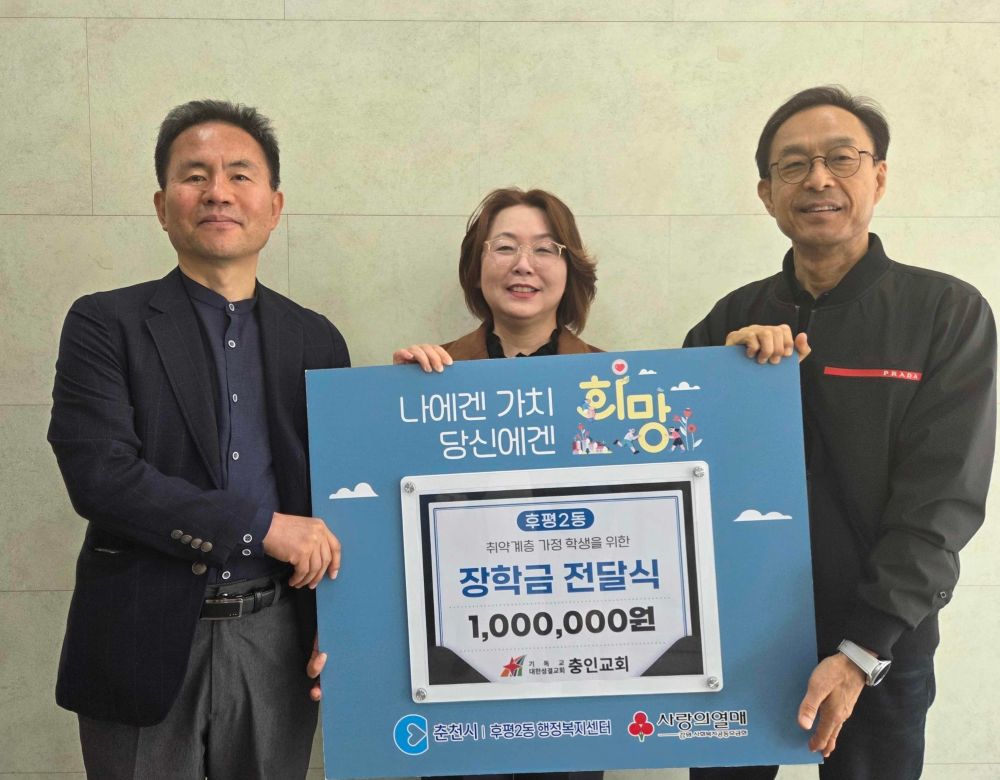 대한성결교회 충인교회(담임목사 이종규)는 2일 후평2동 행정복지센터(동장 마화선)를 방문해 동네 저소득층 학생들을 위한 장학금 100만원을 후원했다. 이번 장학금은 경제적 어려움을 겪는 학생들의 교육 지원에 활용될 예정이다.