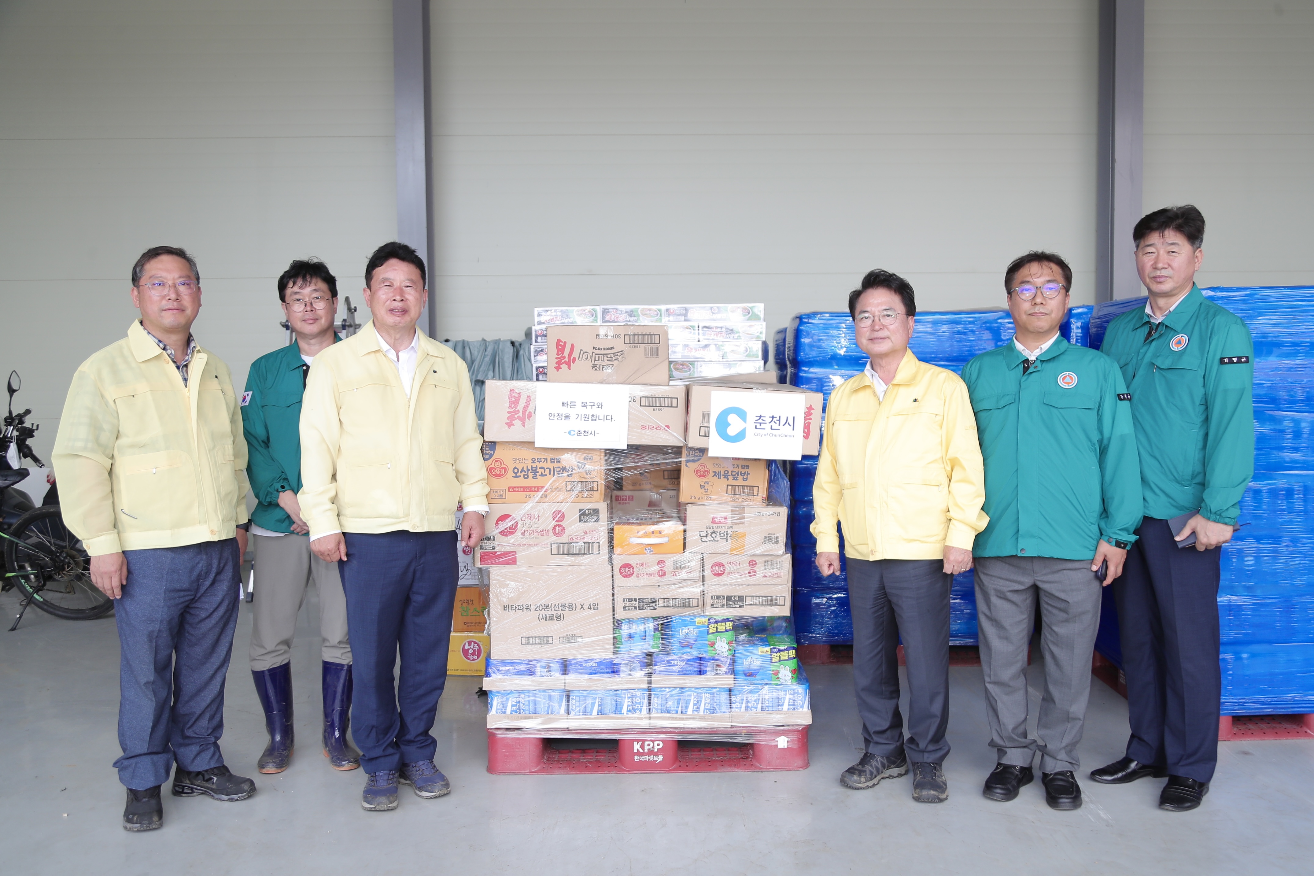육동한 춘천시장은 22일 가평군 조종면 행정복지센터 종합상황실을 찾아 즉석밥(500개), 컵라면(100개), 생수(640병), 음료수(1000개), 과자(30박스) 등의 생필품을 전달하고 이재민들을 위로했다. 이와 함께 시는 가평 지역에 민간 중장비 자원 연계 역할도 지속 수행할 예정이다.