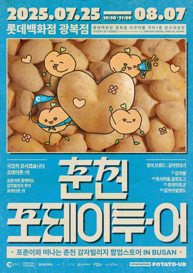 춘천시가 오는 25일부터 내달 7일까지 2주간 부산 롯데 백화점 광복점에서 ‘춘천 관광 홍보 팝업 스토어: 춘천 포테이투-어(Potato-our)’를 개최한다. 이번 팝업스토어는 수도권 중심의 홍보를 광역 단위로 확장하고 소비 주체로 떠오른 Z세대에게 춘천의 젊고 감성적인 이미지를 전달하기 위해 기획됐다.