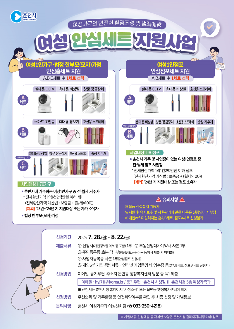 신청은 28일부터 8월 22일까지 전자우편(hyj711@korea.kr), 등기(춘천시 시청길 11, 춘천시청 5층 여성가족과 여성안심세트 담당자)로 신청하거나 주소지 읍면동 행정복지센터를 방문하면 된다.