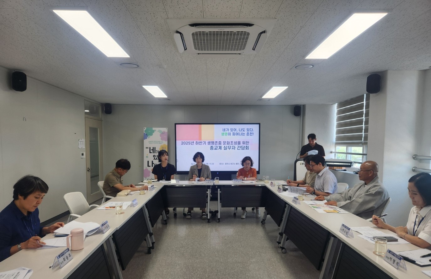 춘천시-종교계, 생명존중 실천 한뜻 - 춘천시, 생명존중 6대 종교계 협약 하반기 실무 간담회 개최 - 종교 행사 연계 자살예방 캠페인, 생명지킴이 교육 등 성과 공유 - 공동 기고·포스터 배포 등 범시민 생명안전망 지속 확산 |